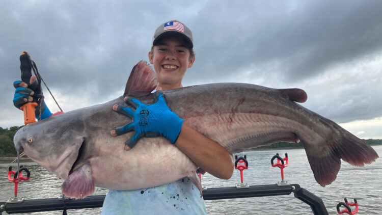 After several minutes, I looked down and saw the braided line getting dangerously close to the submerged prop on the big Suzuki and encouraged Gabe to guide the big fish away from its sharp edges. He leaned all 115 pounds of his 14-year-old frame against the Big Cat Fever bumping rod and yelled out “I can’t move him!” Fortunately, whether it was due to the pressure he was applying or simply because the big fish decided he wanted to go a different direction, he swam away from the blades and back out into open water.