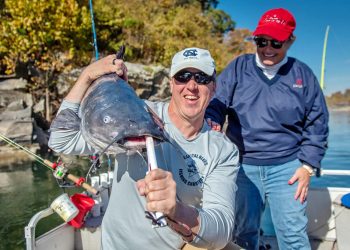 Guide Owen Koch and a customer celebrate catching a big blue catfish in the Potomac River. (Photo courtesy of Capital Blues Fishing Charters) Chesapeake Blues by Brent Frazee Too...