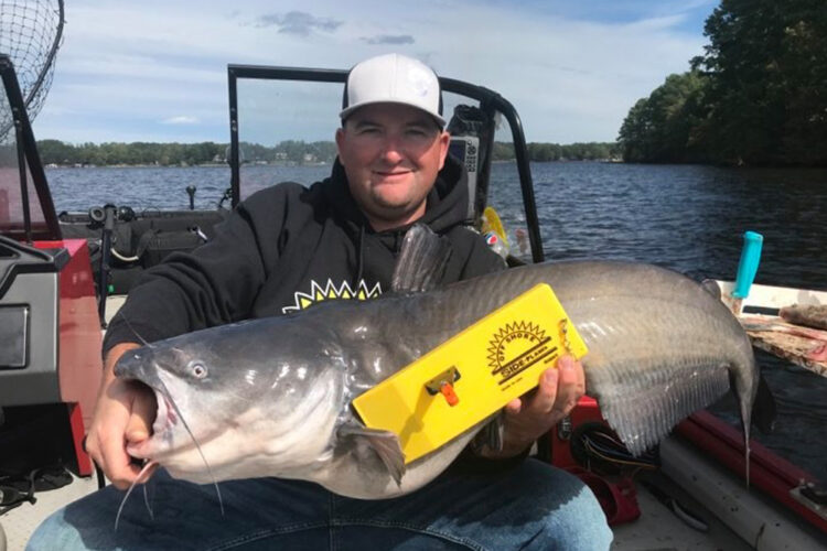 Chris Souders is shown here with a nice blue cat he caught on the Pro Mag Offshore planer boards.