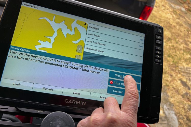 Garmin’s home screen allows an angler to put the unit in sleep mode to conserve power.