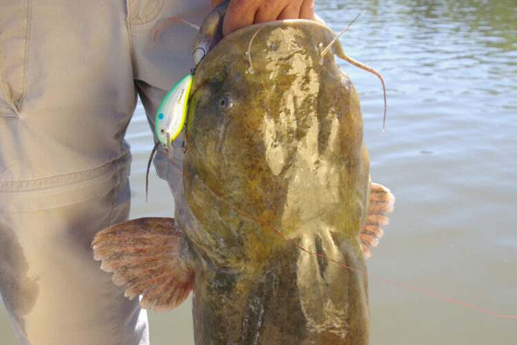 After their eggs hatch and the fry are big enough to survive on their own, the parent fish often remain near the spawning site for several weeks, feeding ravenously to replenish body fat and muscle lost to spawning activities. If the water isn’t too murky, you can entice these big flatties using deep-diving, shad-imitation crankbaits. Hungry flatheads are suckers for a tight-wiggling, fishy-looking plug darting past.