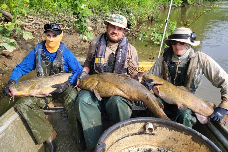 The Indiana Department of Natural Resources is currently involved with one of the largest catfish research projects in the agency’s history. Here, fisheries biologists show some of the big flatheads caught using a trotline while surveying catfish in the Wabash River, a tributary of the Ohio River. (Photo courtesy of Indiana DNR)