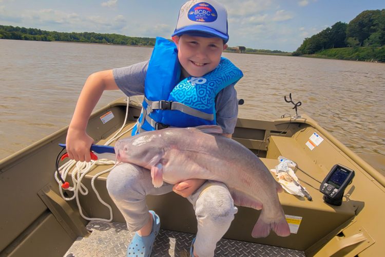 The author’s son Jake with a nice blue cat caught in Maryland’s Patuxent River. The smile on