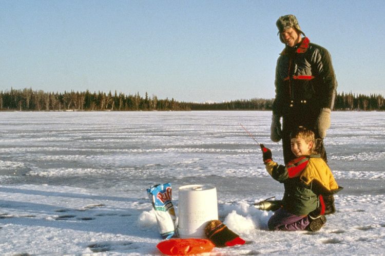 A boy and his father try their hand at ice fishing at Kenai National Wildlife Refuge