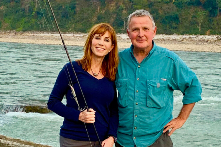 Anietra Hamper and fishing expedition guide Ian Henderson in India prepping to catch and release goonch catfish.