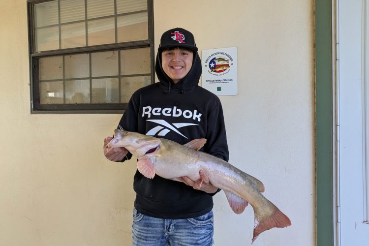 Victor Garcia’s smile says it all. He’s proud to have caught this nice flathead, a possible junior record for Twin Buttes Reservoir. (courtesy of Texas Parks & Wildlife)